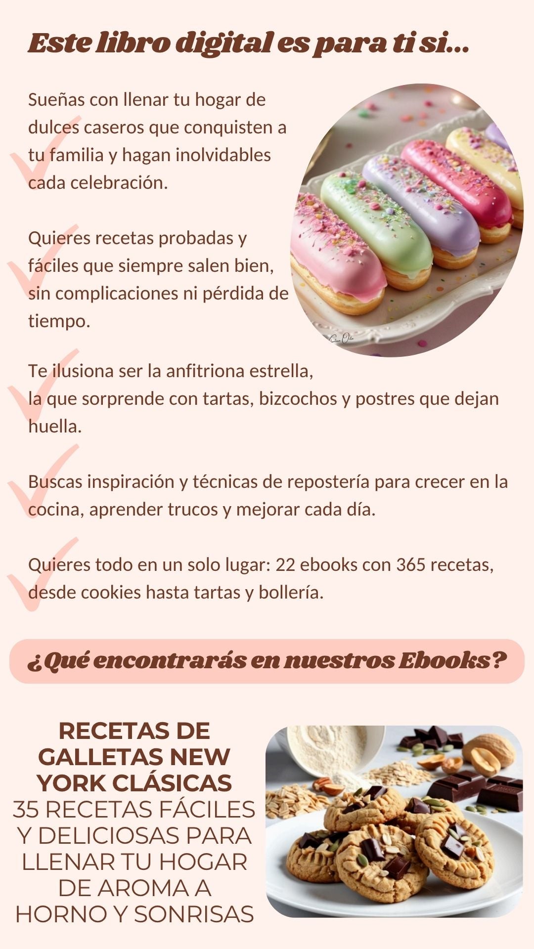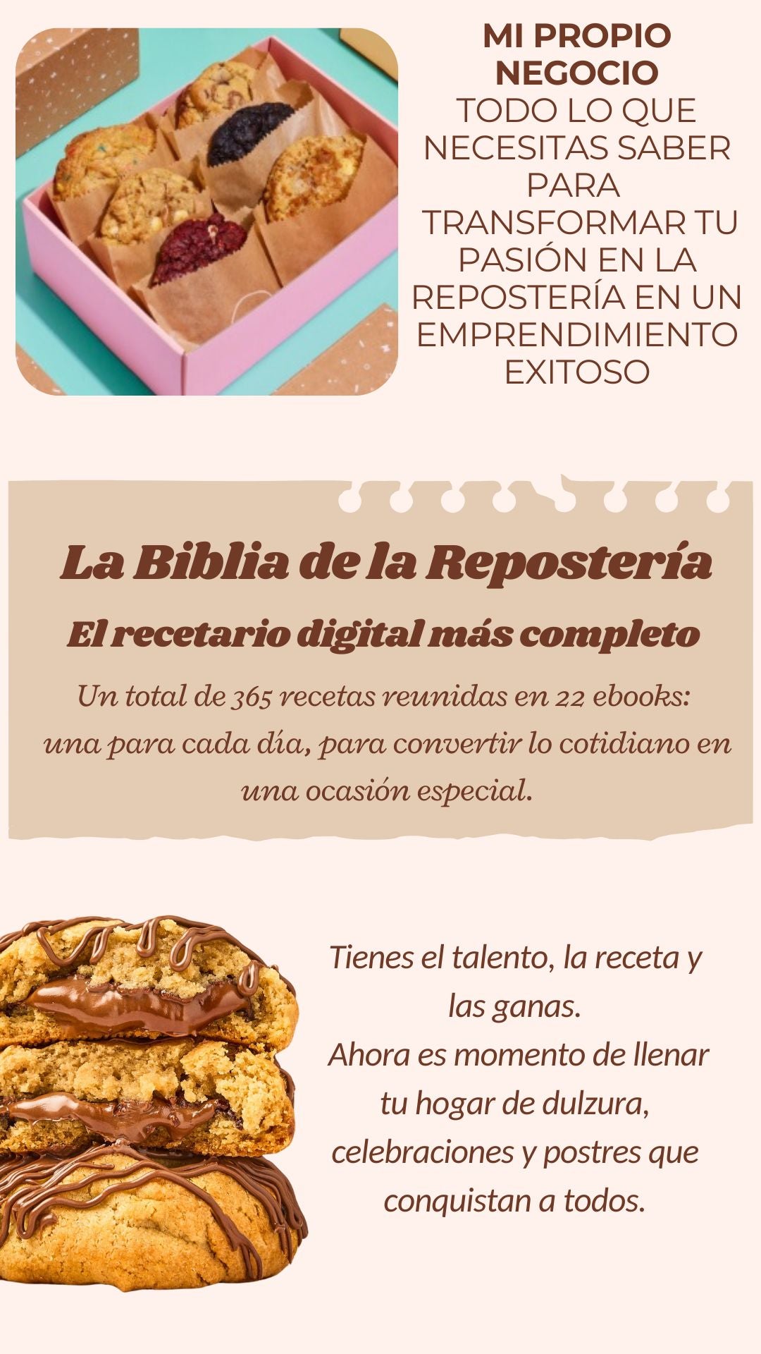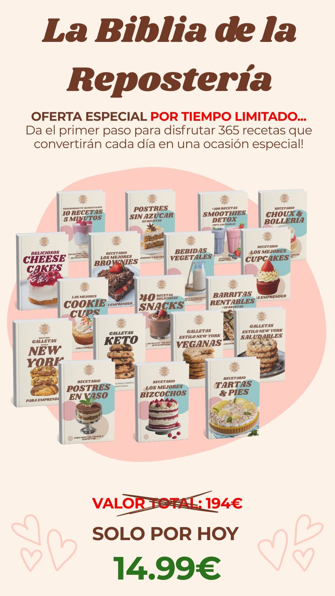 Con La Biblia de la Repostería tendrás acceso a 365 recetas probadas paso a paso, reunidas en 22 ebooks completos para que cada día del año puedas hornear algo nuevo y sorprender a los tuyos.