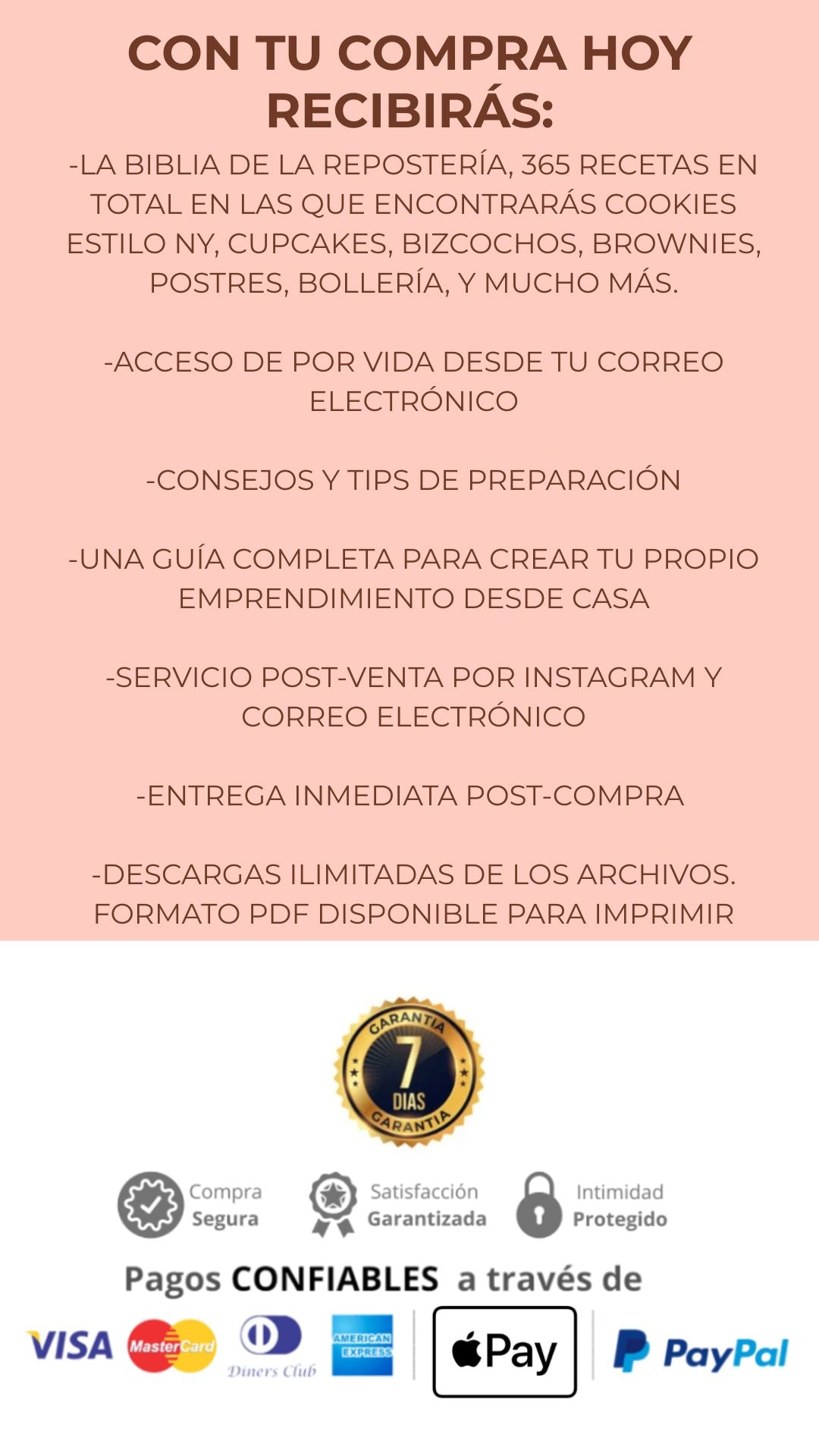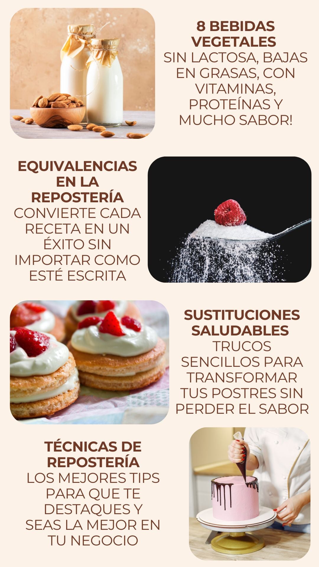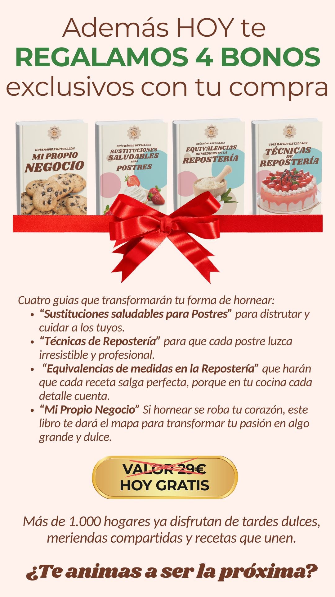 ✅ Incluye 4 guías esenciales con técnicas, sustituciones, equivalencias, para que tus recetas salgan bien desde el primer intento y estrategias de venta por si deseas transformar tu pasión en ingresos.