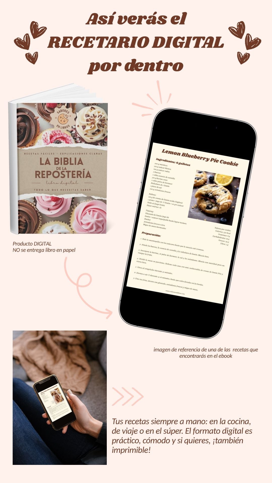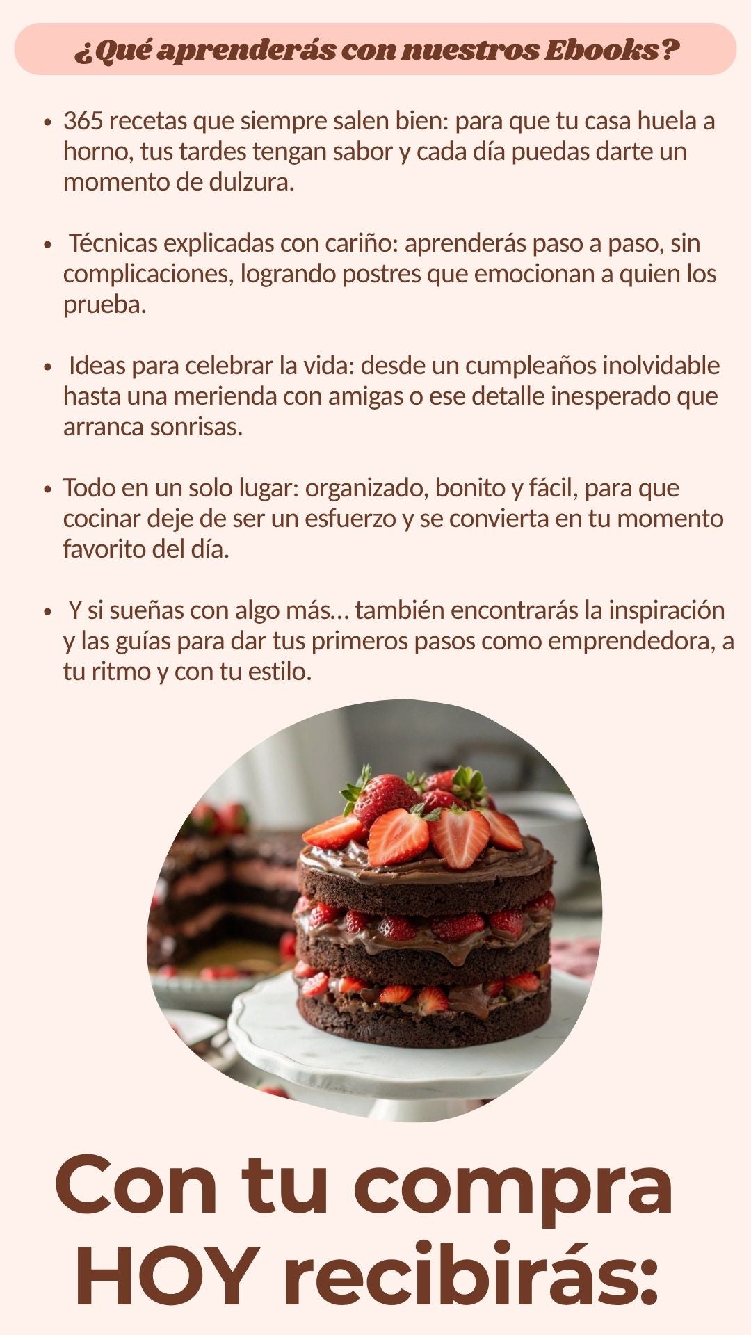 Porque estos ebooks te ahorran tiempo ya que tienes 365 recetas de repostería en un solo lugar. Gracias a los conocimientos de los profesionales que lo crearon, tendrás una receta para cada día del año para que siempre puedas hornear algo nuevo y sorprender a los tuyos.